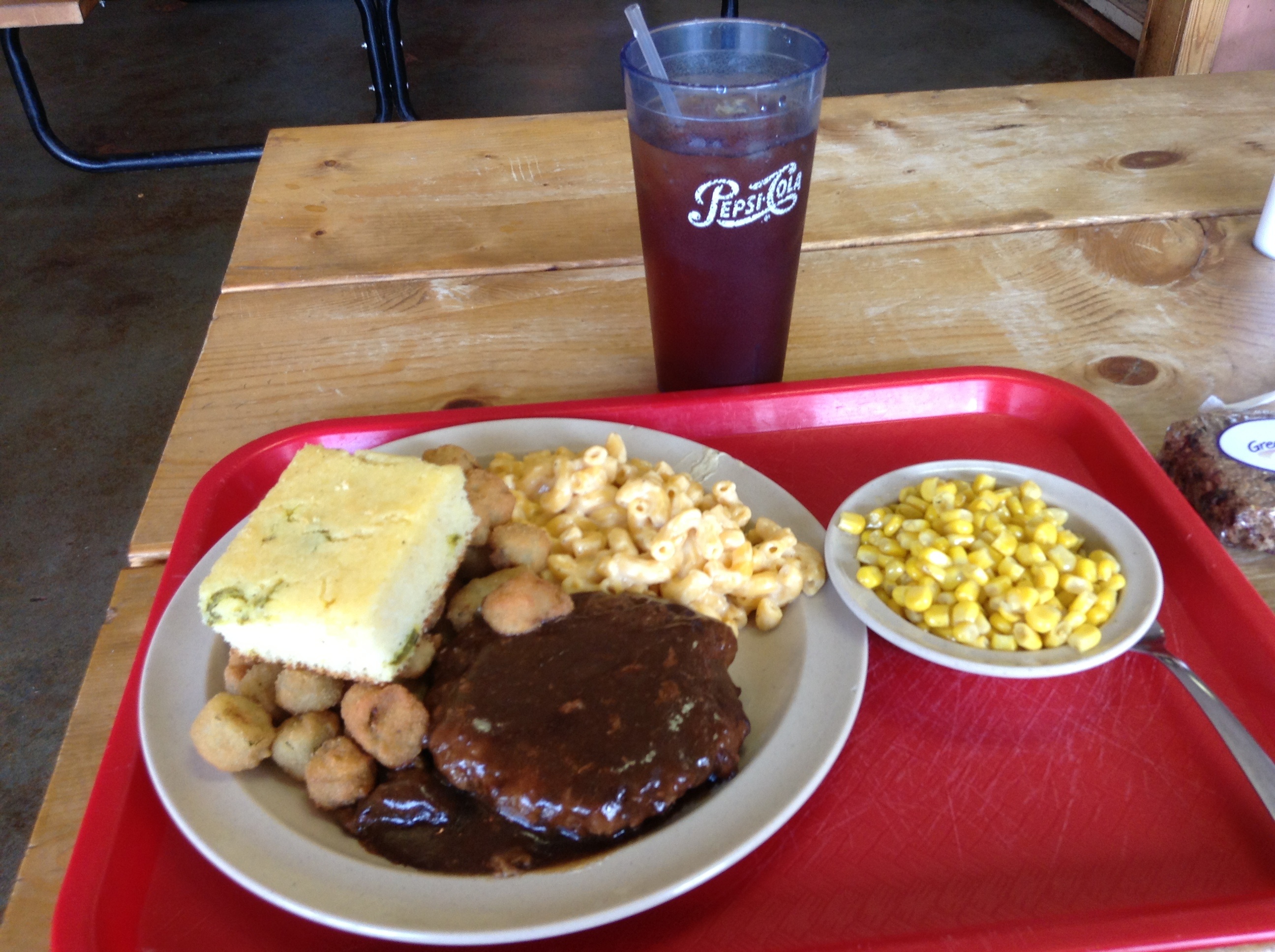 When inquiring about food choices, I learned of a BBQ place called The Pigskin just a few blocks away. How could I resist? I headed over and had the lunch special; smothered hamburger steak, fried ochre, mac n cheese, corn bread and butter corn… and sweet tea.